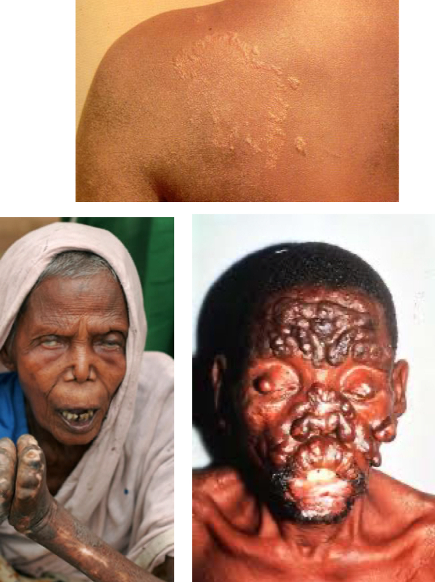 - S/S: granulomas in skin and limbs, disfigurement, “lions face”(disfigurement of philtrum)