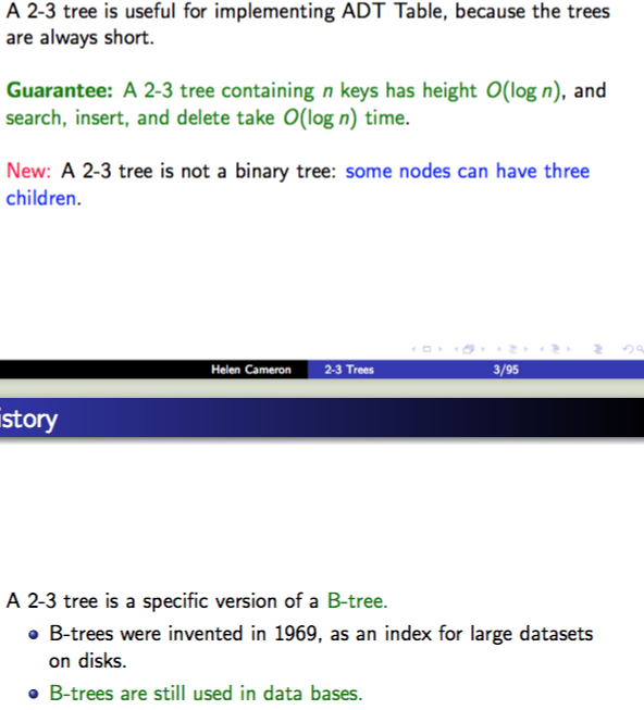What is a 2-3 tree? What is it’s guarantee? How does it compare to a Binary Tree?