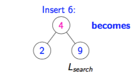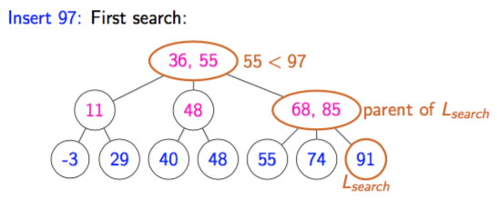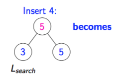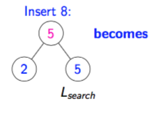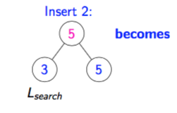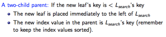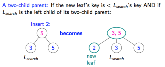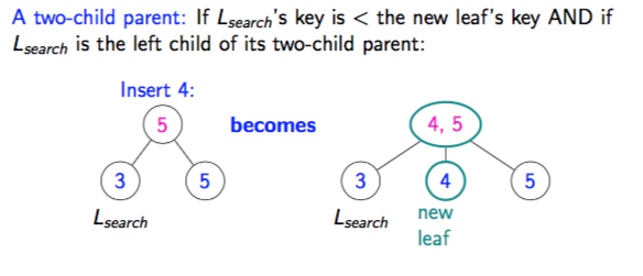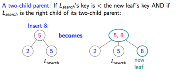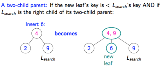 How does a two-child parent insert work if the new leaf’s key is < Lsearch’s key?