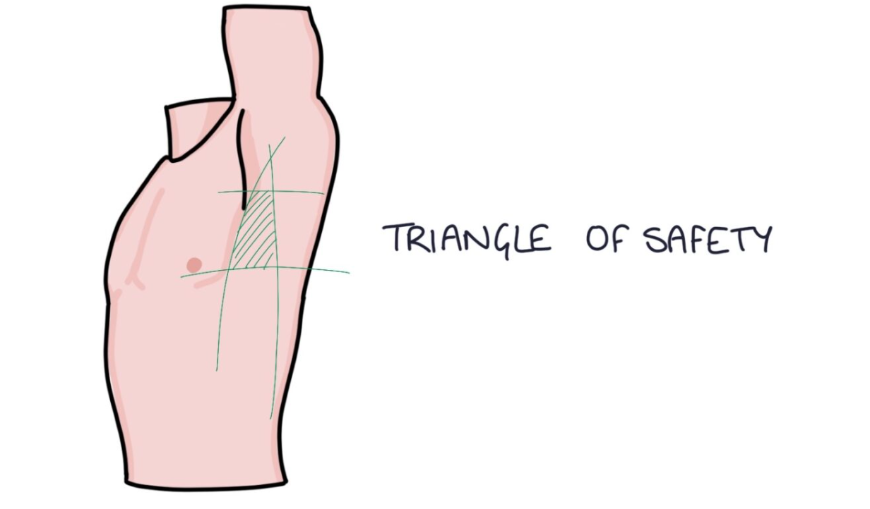 Chest drains can be inserted in the emergency department or on the ward. They are inserted in the “triangle of safety”. This triangle is formed by: