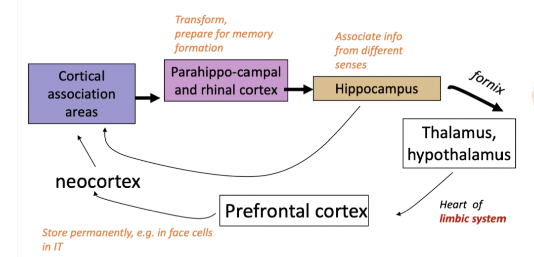 cortical association areas (sensory input)—-> parahippocampla and rhinal cortex—> hippocmpaus —-> fornix—> thalmus/hypothamaus—-> prefrontal cortex stor permanently