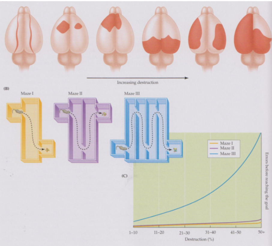 His results showed that quite large areas of cerebral cortex had to be removed to prevent learning and memory of complex tasks and that these lesions had little effects on simple tasks.