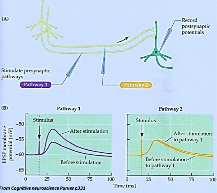 LTP - increased response can increase for a long time once you’ve changed it (to do with genetic mobilisation and activating transcription factors which will release more receptors and neurotransmitters)