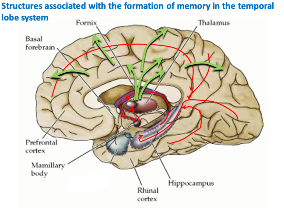 The structures associated with the formation of memory are in the temporal lobe system and are;
