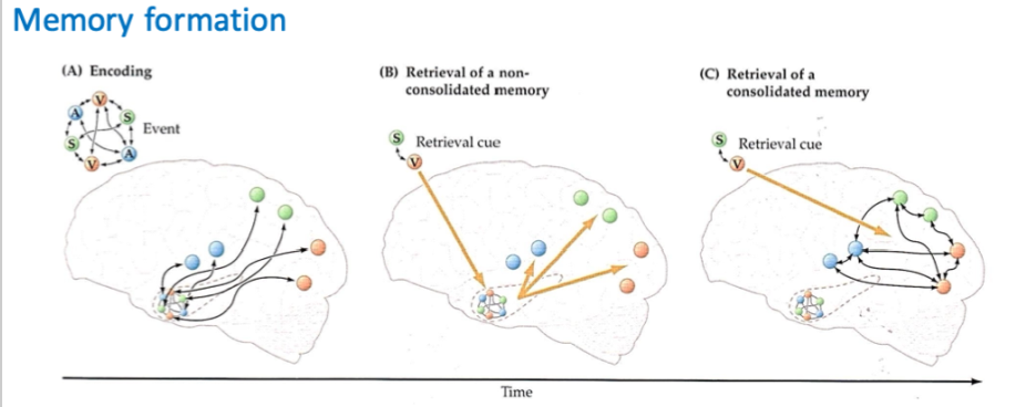After consolidation of the memory retrieval can be initiated directly from the sensory cortices (stimulates less hippocampus but more storage points)