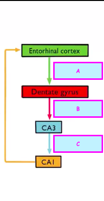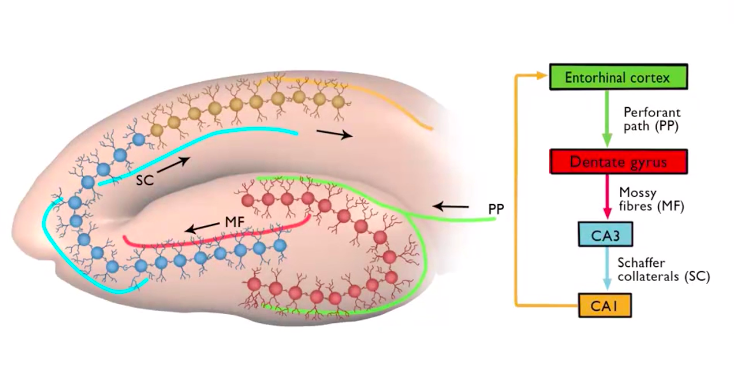 To the pyrimadal cells of CA3 hippocampal region via mossy fibres (neurones in the dentate gyrus)