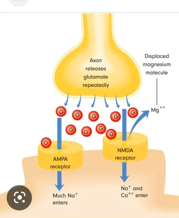 * Depolarisation of NMDA causes release of Mg2+ and unblocks the channel