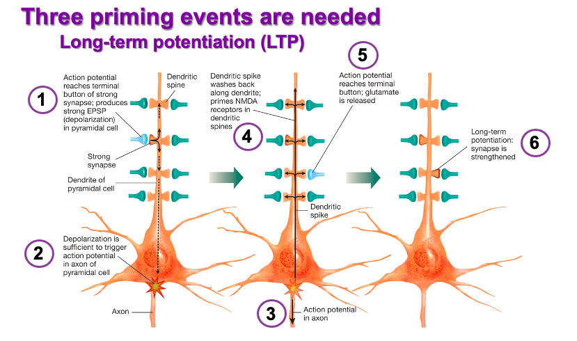 Early LTP: ncrease in the amount of glutamate released by the terminal buttons