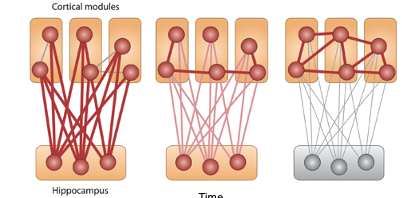 Over time, the cortical modules form connections among themselves and the connections with the hippocampus become less important