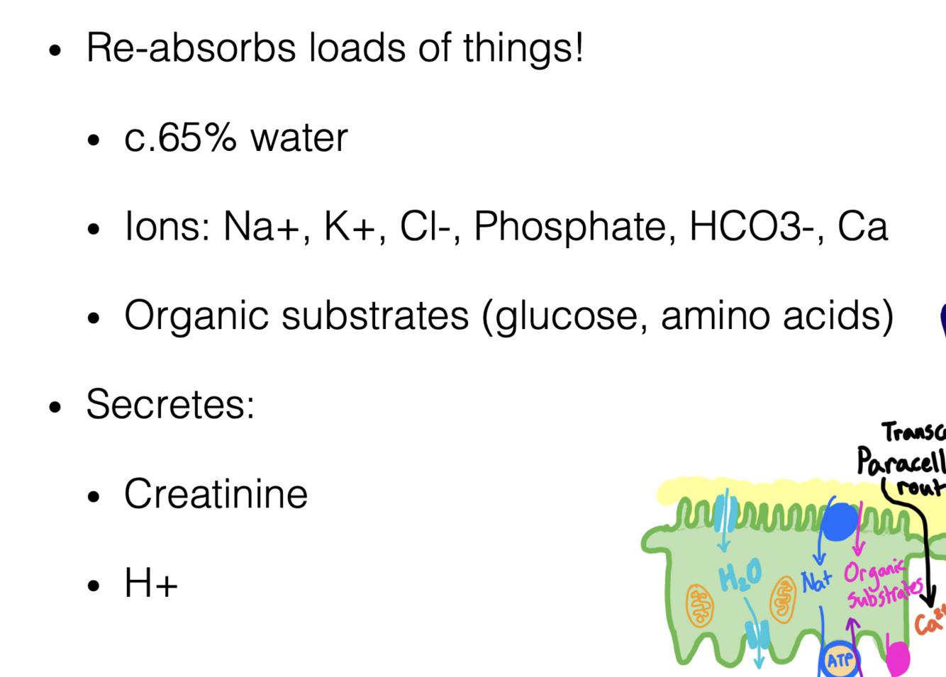 Draw a diagram of the transcellular transport that takes place in the PCT, and explain how it is specially designed histologically for this function.