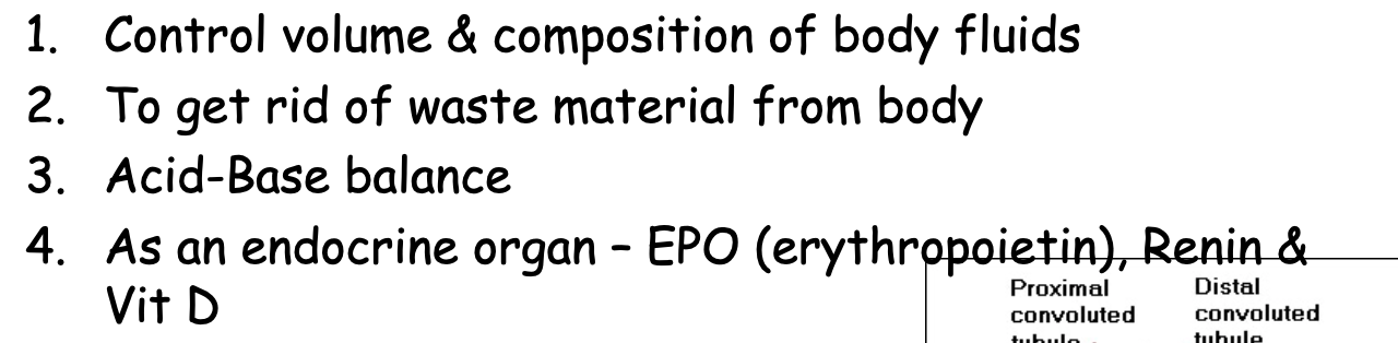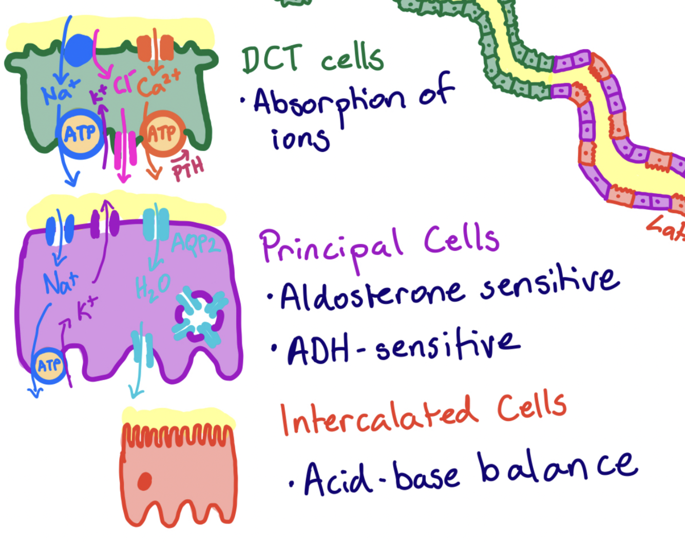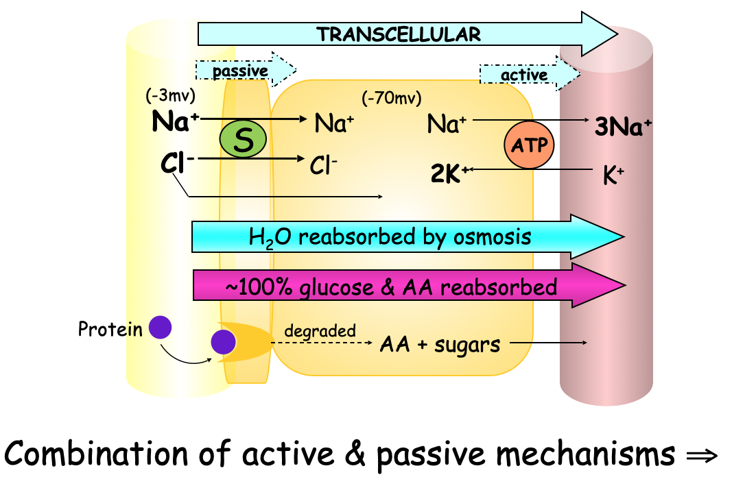 Thin epithelial cells, no brush border, few mitochondria & low metabolic activity.