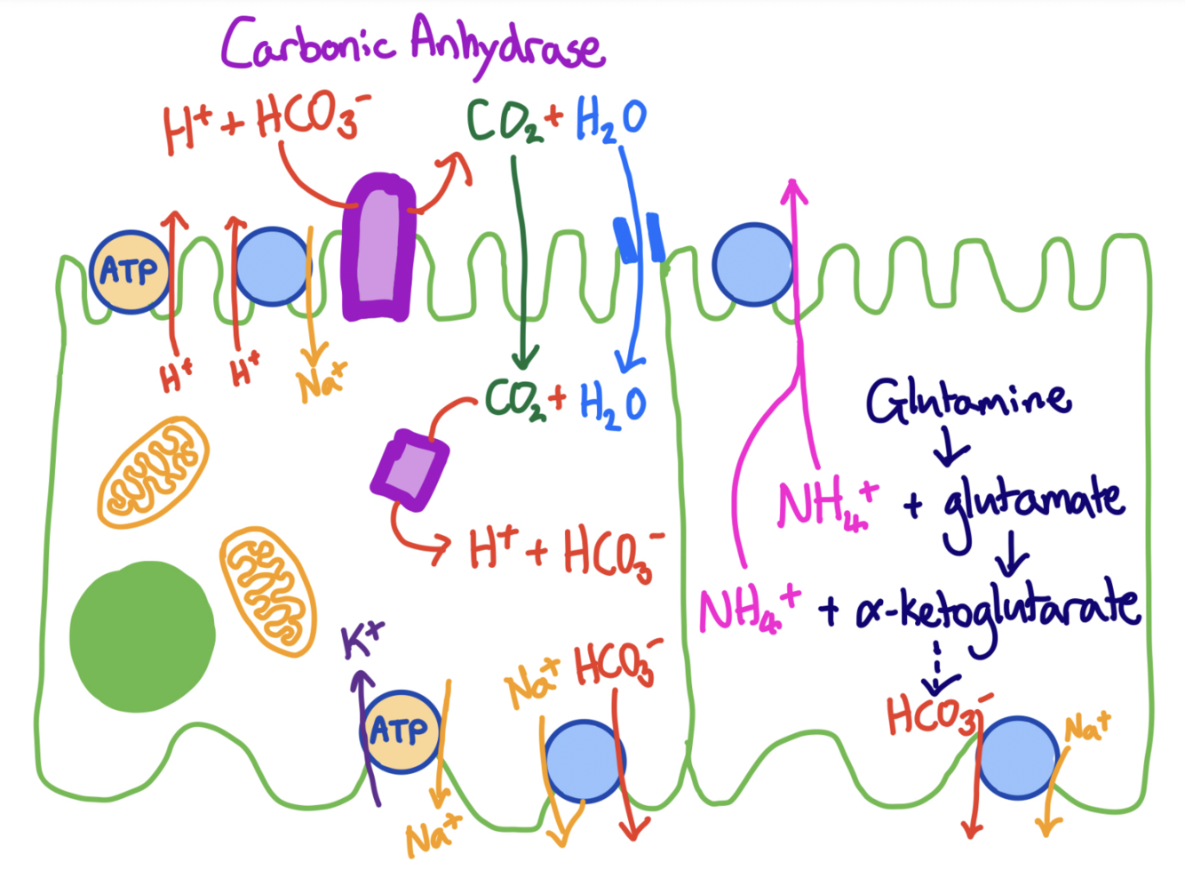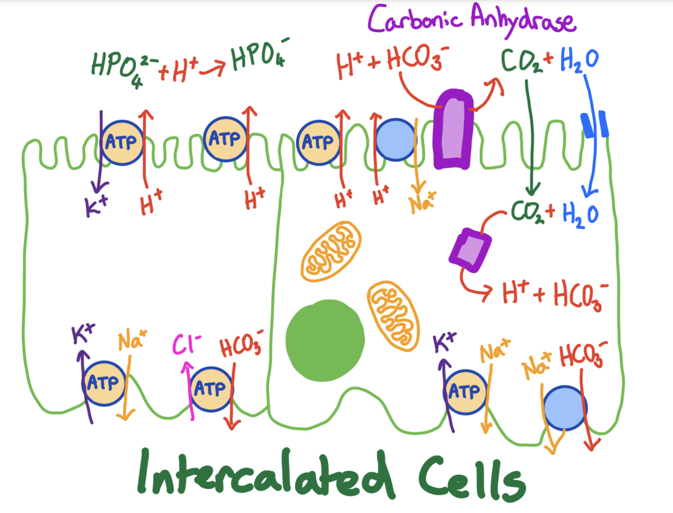 H+ is pumped back into filtrate to take part in the Phosphate buffer system, and bicarb is also reabsorbed vis chloride shift mecahnism in addition to Na+ transporter