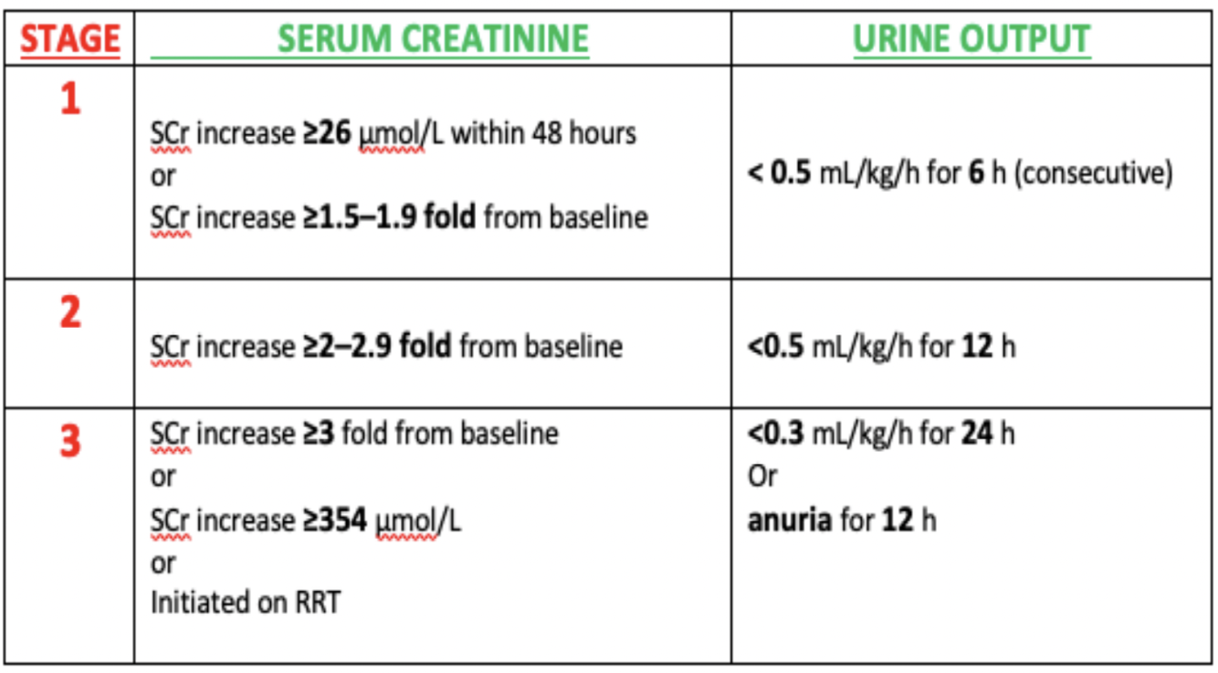 Give an overview of AKI, including a table of criteria for stages 1, 2 and 3