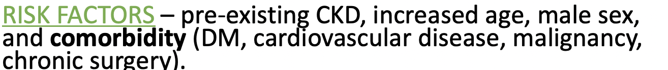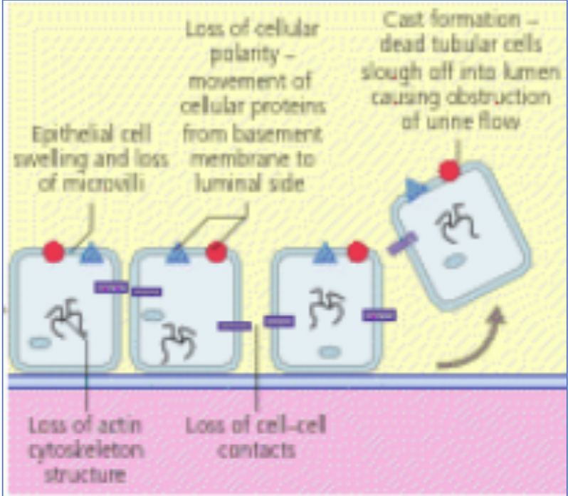 Usually follows prolonged ischaemia (i.e. pre- renal AKI).