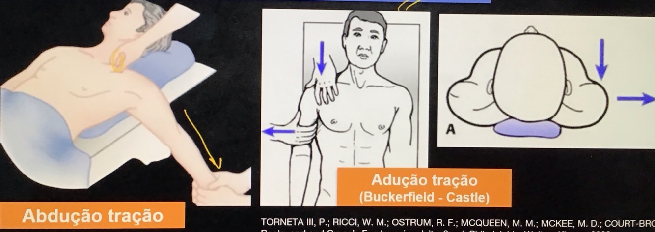- abdução tração: faz tração pra lateral e faz um fulcro na parte lateral da clavícula pata tentar anteriorizar a parte medial
