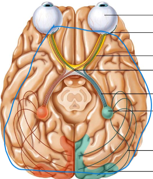 Input is taken through the optic nerves to the optic chiasma, which is where desiccation happens. Then the information is taken through optic tracts into the thalamus, which uses optical radiation to send the info to the optical cortex.