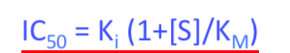 Using the equation below, what happens to the IC50 when Km is low and [S] is high?