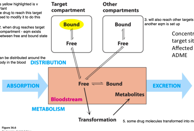 What are the 4 factors that determine whether a drug will reach its target, draw a diagram to aid your answer?