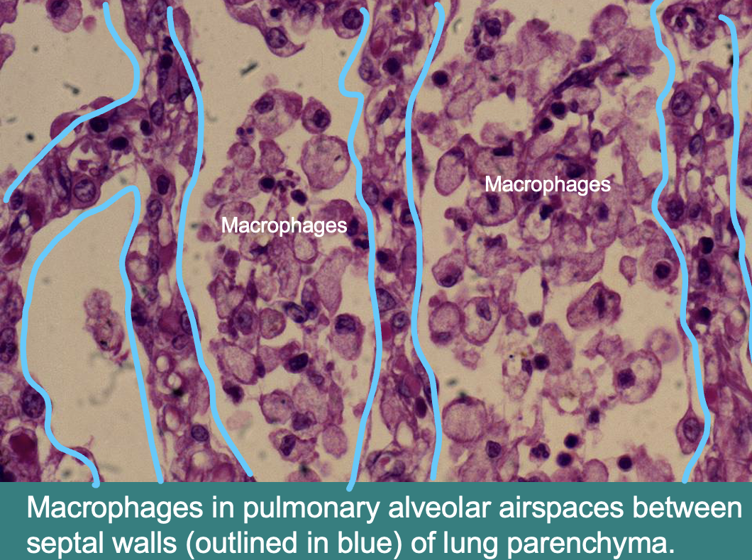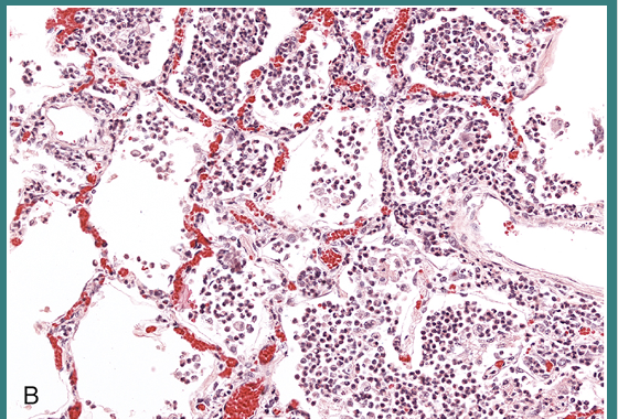 Neutrophils in pulmonary alveolar airspaces, acute bronchopneumonia