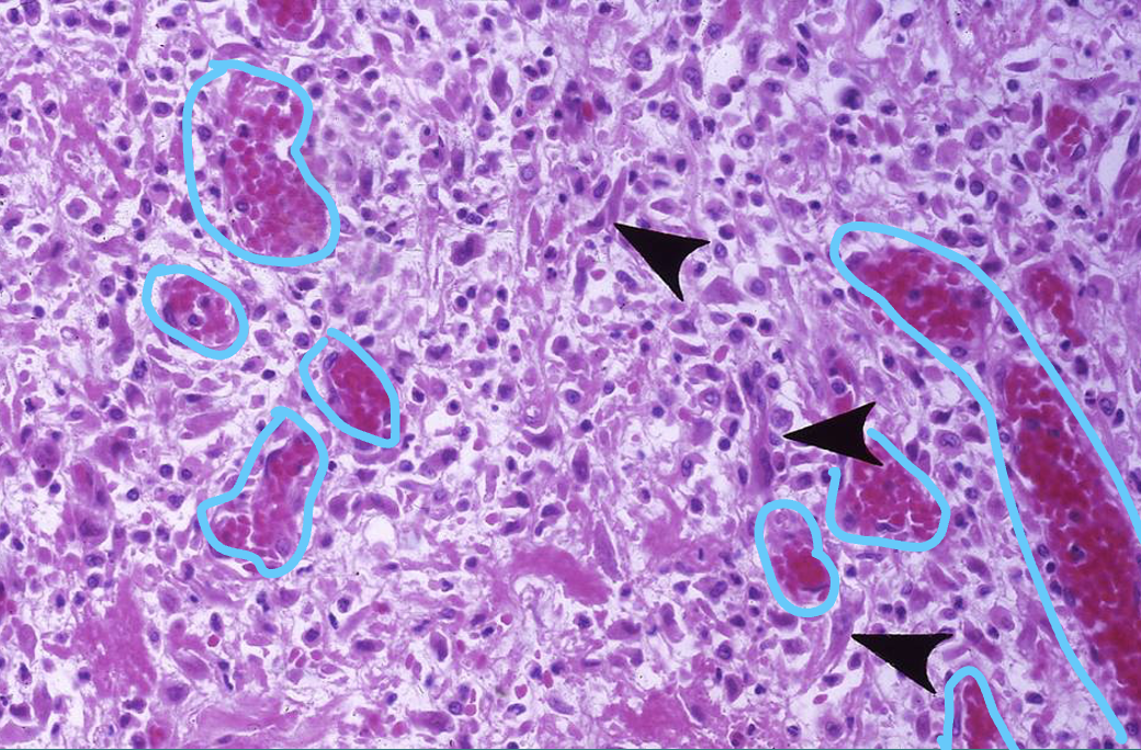 Granulation tissue with proliferating capillaries (circled), and fibroblasts (arrowheads)
