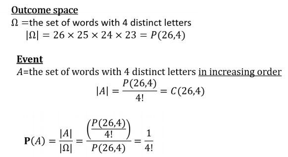 What is the probability that a random word of length 4 with distinct letters has the letters in increasing alphabetic order?