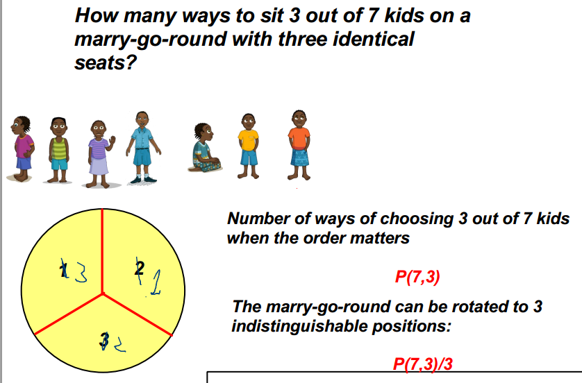 How many ways to sit 3 out of 7 kids on a marry-go-round with three identical seats?