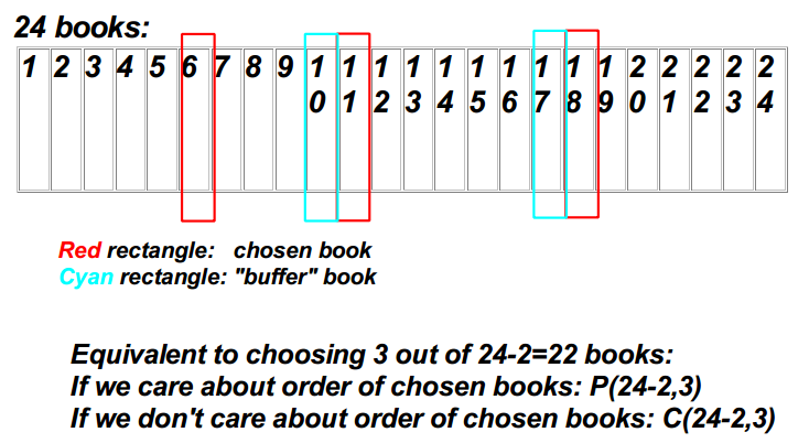 You have a shelf with 24 books on it. You can pick any 3 books but no two picked books can be right next to each other. How many choices do you have?