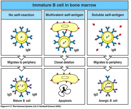 Self-reactive B-cells outside the bone marrow either die by apoptosis or are rendered anergic when they encounter their self-antigen. This is called peripheral tolerance.