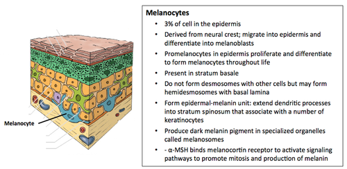 ______________ make up 3% of the cells in the epidermis. They are derived from neural crest cells and migrate into the epidermis to differentiate into melanoblasts. They are present in the stratum basale; however, they do not form hemidesmosomes with other other cells, only basal lamina