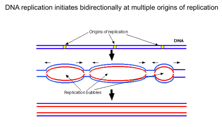 leading/lagging strand synthesis occur simultaneously **as replication forks go bidirectionally away from the ORI **