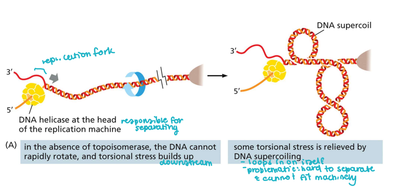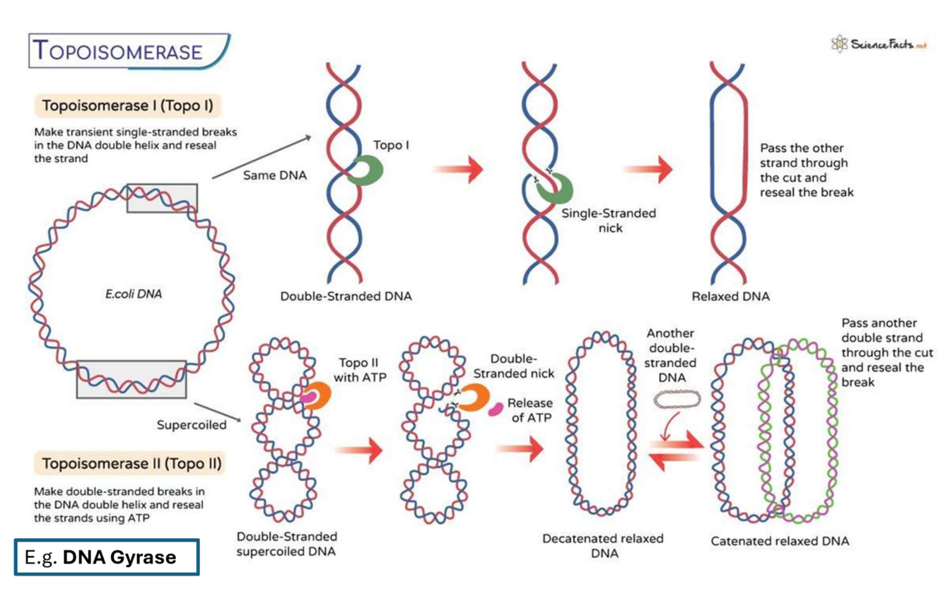 -cuts both DNA strands, causes unwrapping of the coiling (relieves torsial strain)