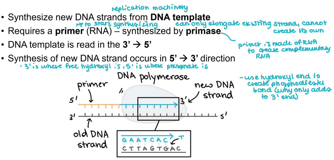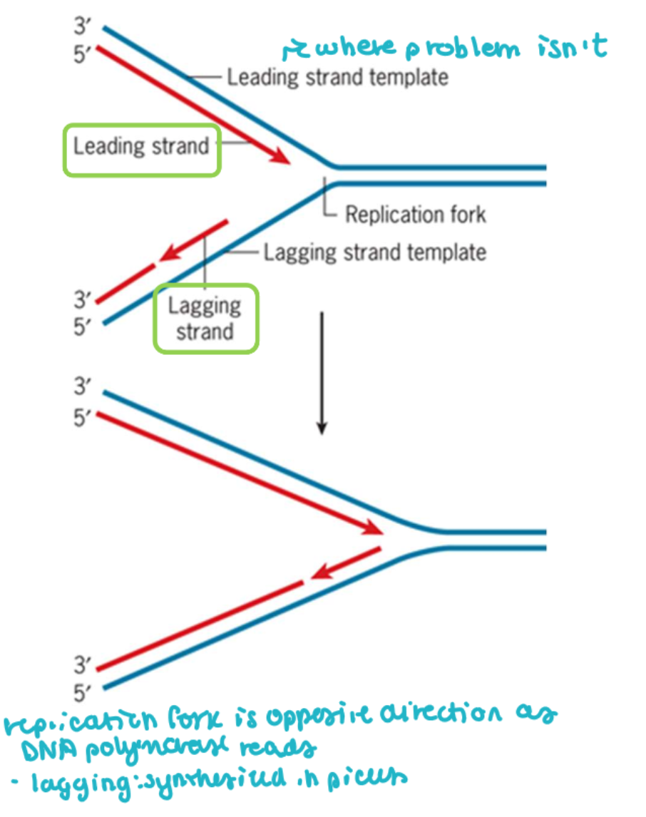 -DNA polymerase travels along template in 3’ to 5’ direction