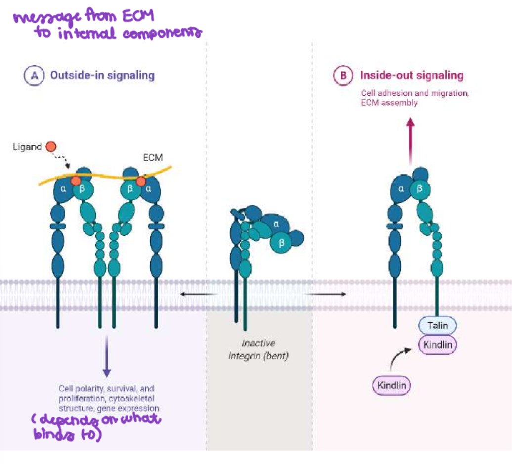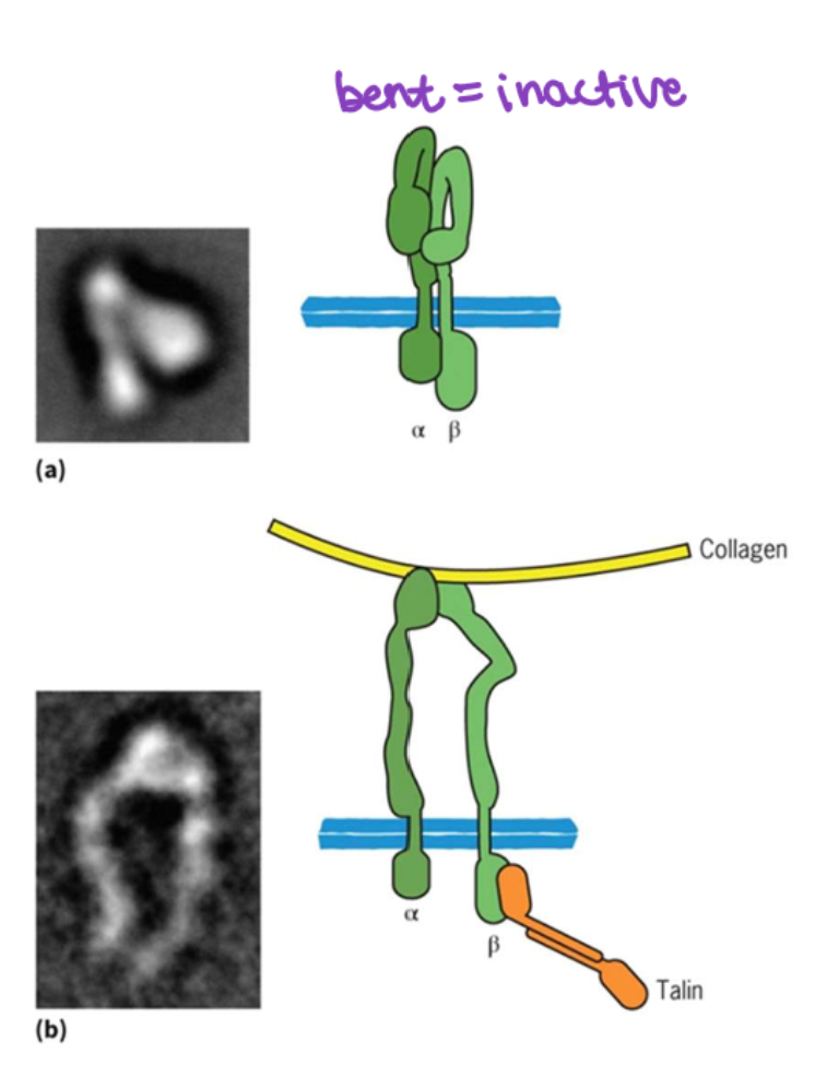 -2 conformations: bent=inactive form, upright=active form (can now bind to different components of ECM)