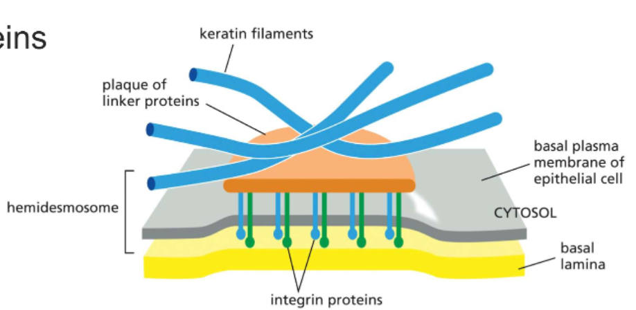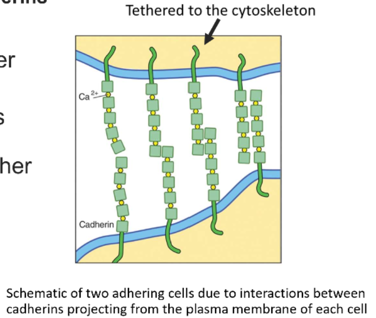 3. cadherins: attach to protein plaques, connect to cadherins on other cells