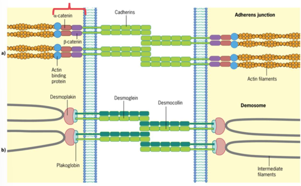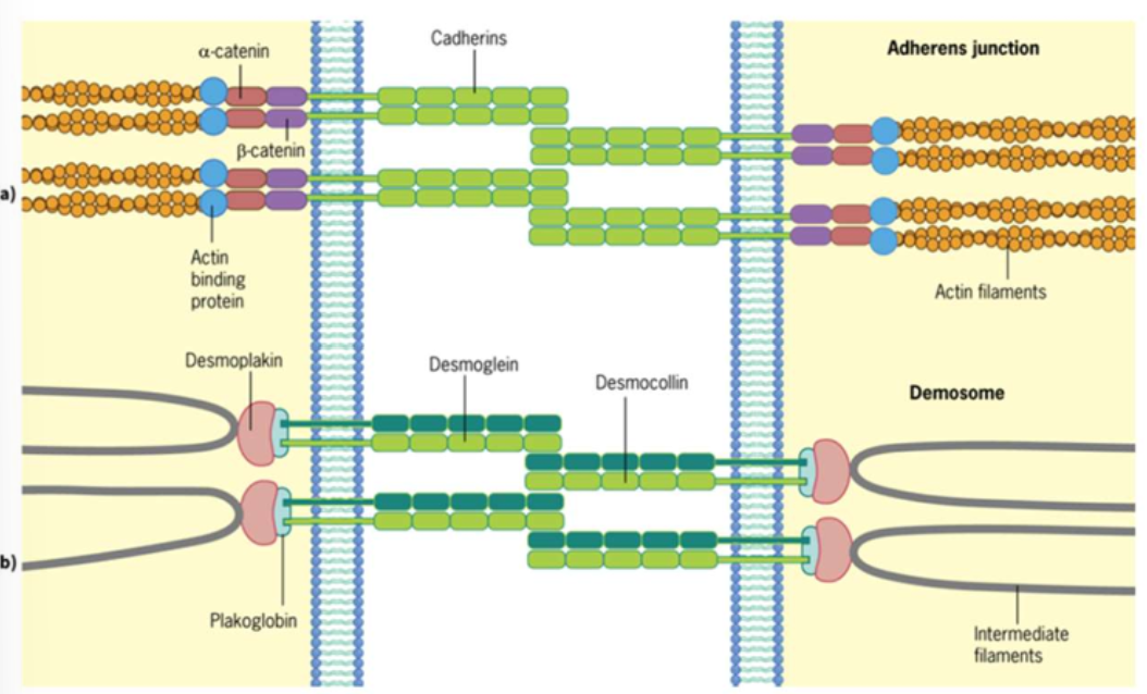 -describe cadherins-based cell-cell interactions (adherens junctions, desmosomes)