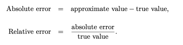 What are the formula’s for absolute and relative error?