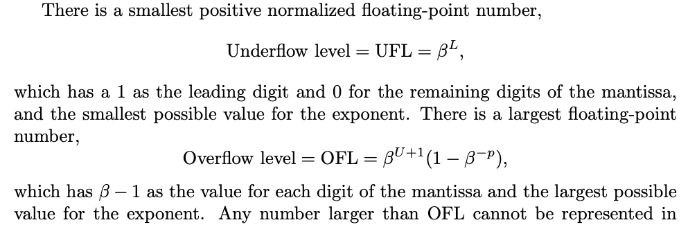 What is the meaning and formula of an overflow and underflow level of a floating point system?
