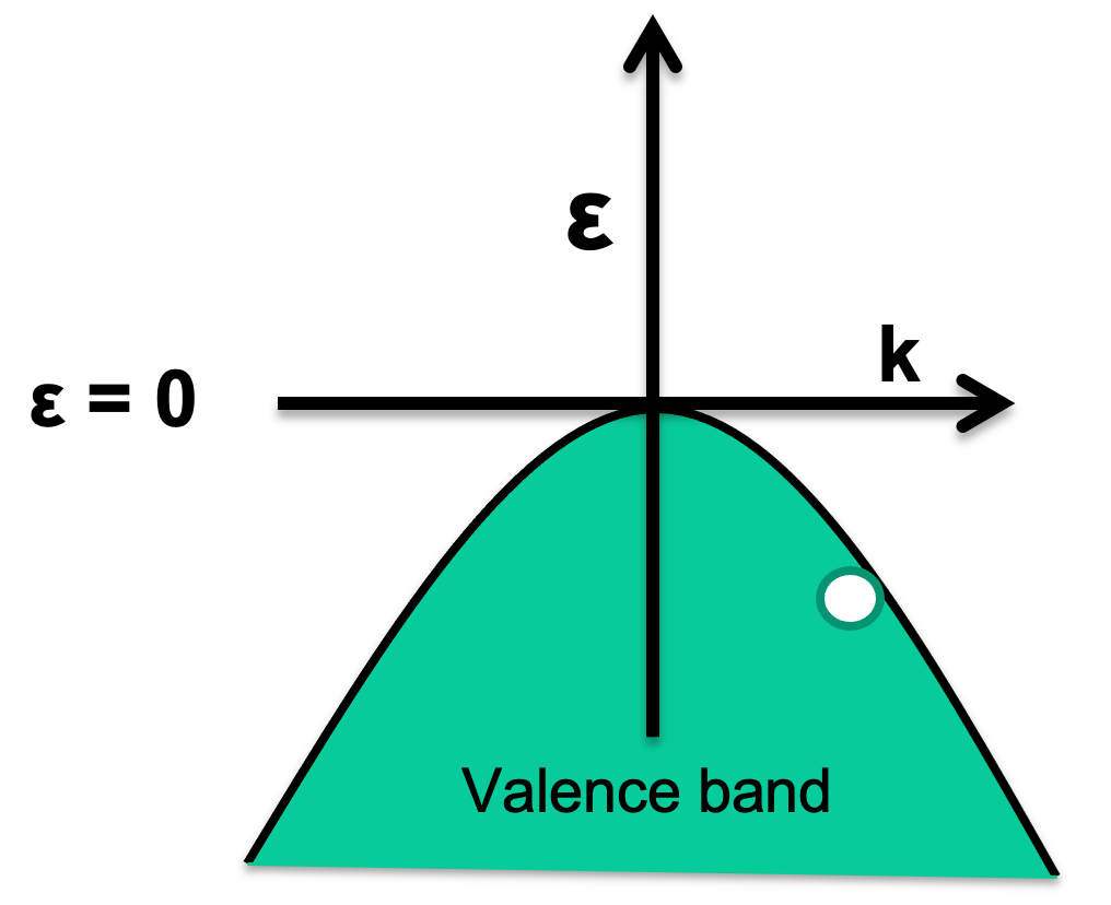 An empty state (vacancy) with positive energy, charge, and effective mass due to the absence of an electron. It is at the top of the valence band so when an electron is removed the total energy of the band increases positively (by +ε as an electron with -ε energy has been removed).