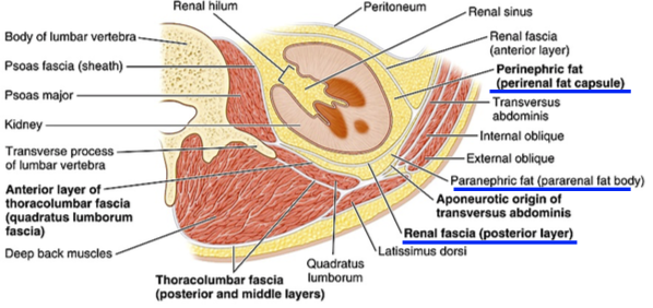 The kidney is surrounded by fat. There are 3 layers: