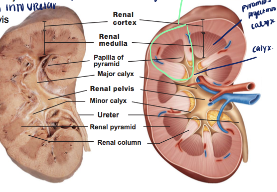 The renal pelvis is where urine is collected. The renal pelvis has projections called renal calyxes (major and minor).