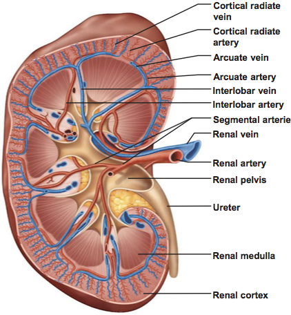Aorta> renal artery enters the hilum and branches into> segmental artery, goes to a certain segment branches into > interlobar arteries > arcuate artery, which goes overtop the renal pyramid > cortical radiate artery > afferent arteriole> [glomerular capillaries] > efferent arteriole > peritubular capillaries and vasa recta > cortical radiate vein > arcuate vein > interlobar vein > renal vein > IVC.