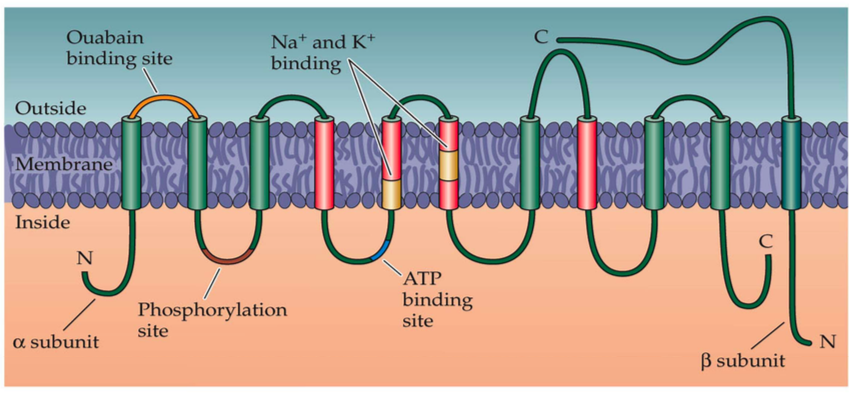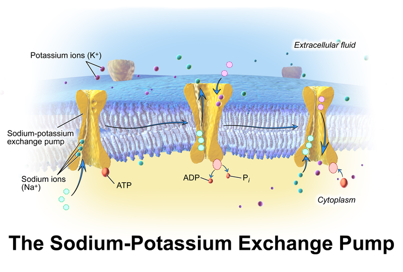 -In order to maintain the cell membrane potential, cells keep a low concentration of sodium ions and high levels of potassium ions within the cell (intracellular). -The sodium-potassium pump moves 3 sodium ions out and moves 2 potassium ions in, thus, in total, removing one positive charge carrier from the intracellular space. (for each ATP that is broken down)