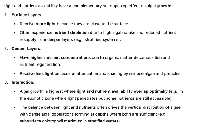Surface layers receive more light but may have nutrient depletion, while deeper layers have more nutrients but less light.