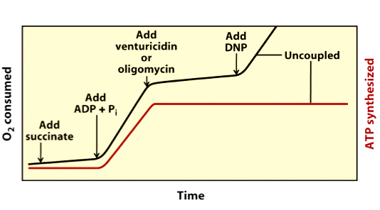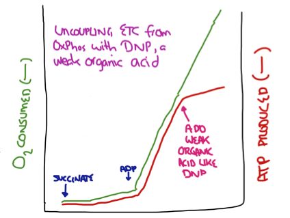 Weak acid uncouples O2 consumpt & ATP synth. there is still great e- flow but there is no longer a need for ATP synthesis.