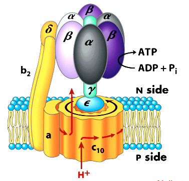 F1: has 3 α, β that can bind ATP or ADP & Pi, conformations of these cause a rotary motion and drive ATP synthesis.
