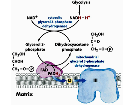 takes NADH (that was from glycolysis) dumps e- into DHAP to make Glycerol-3P→ gets converted back to DHAP and e- go to another enzyme that dumps them to Q.