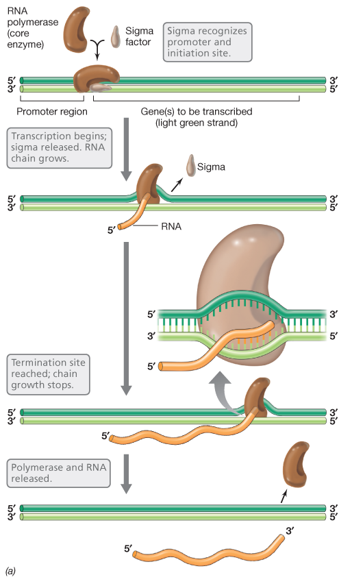 - RNA poly unwinds the DNA at the promoter, the sigma factor falls off, and the core RNA poly beings to make a single strand of RNA that is complementary to the template strand.