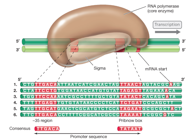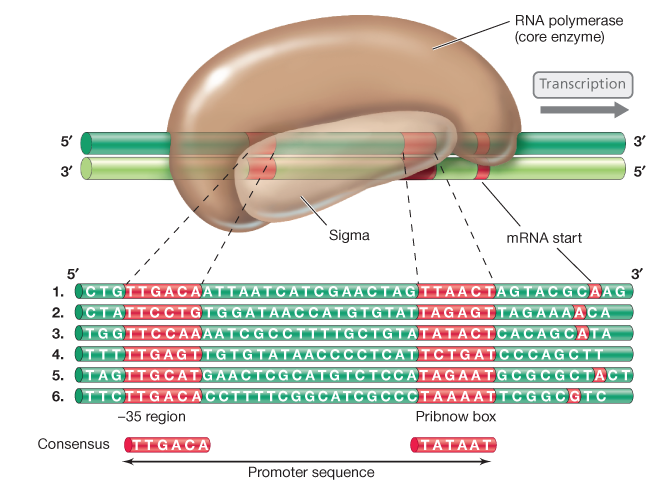 RNA polymerase (core enzyme of synthesis RNA) + sigma factor, σ (recongnizes site for RNA synthesis to begin) = holoenzyme