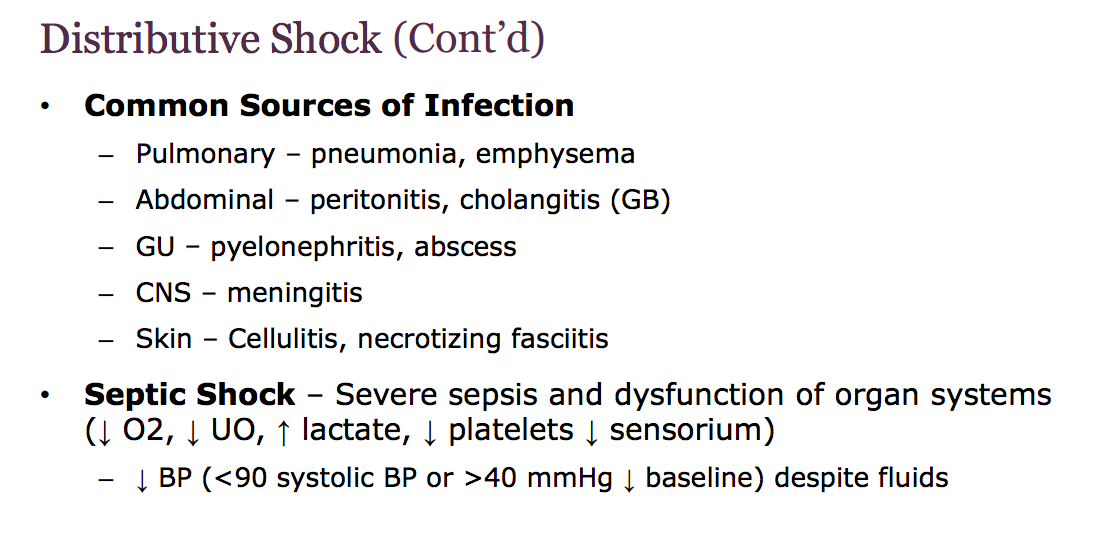 Severe sepsis and dysfunction of organ system w/ hypotension (<90 systolic or >40 mmHg ↓ baseline) despite fluids