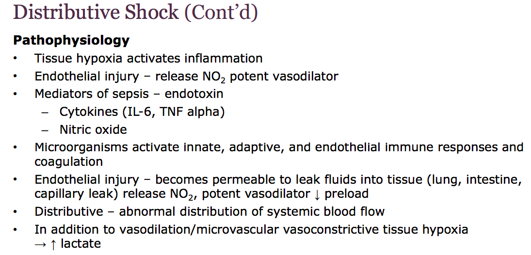 Becomes permeable and leaks fluid into tissue (lung, intestine, capillary leak) releases NO2 = potent vasodilator which ↓ preload